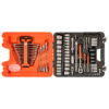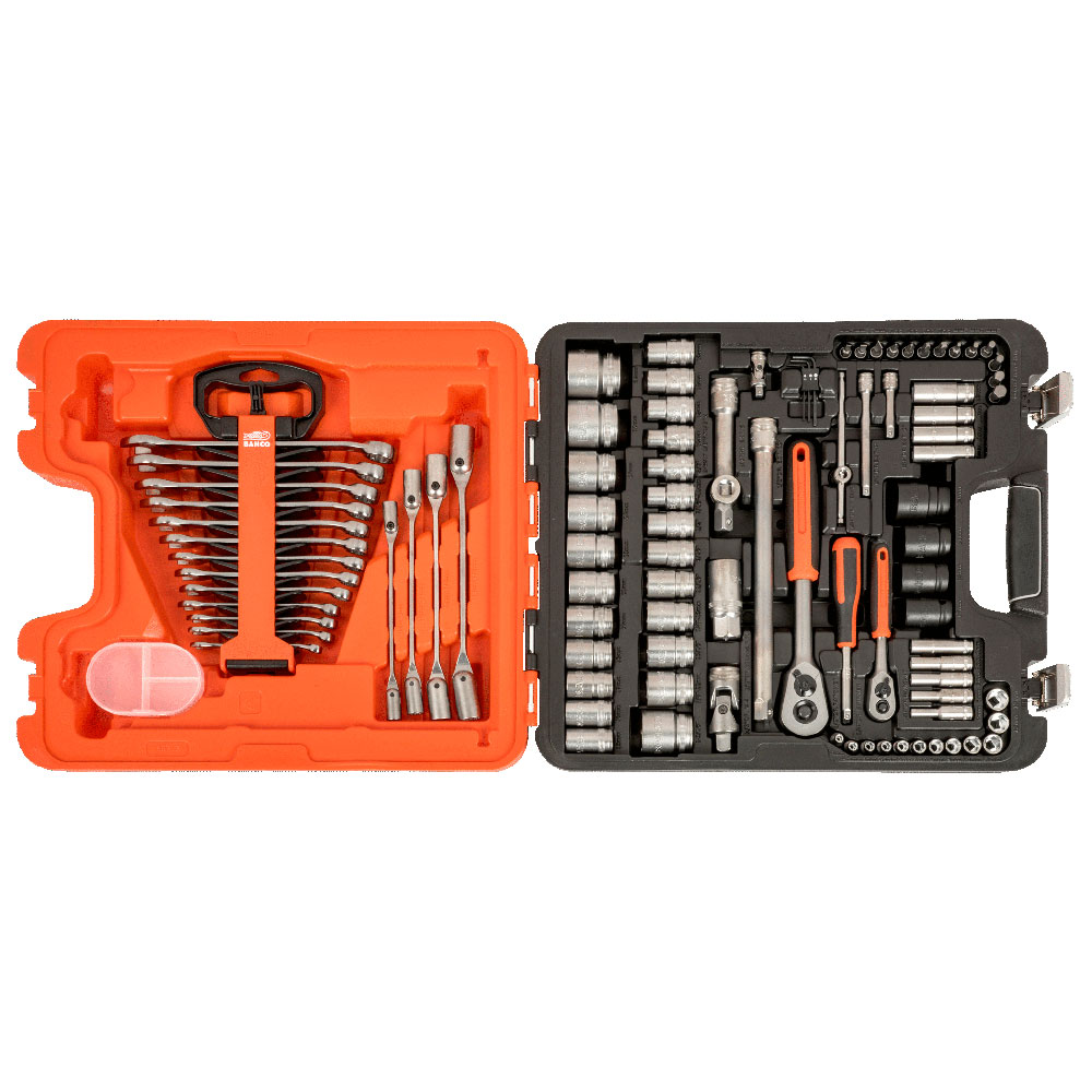 1/4″ og 1/2″ firkanttilkopling. Mekanikersett i slagfast koffert i polypropen. Inneholder: 94 verktøy i mattforkrommet kromvanadiumstål. Alle hylser, fast- og leddnøkler har Dynamic Drive-profil.