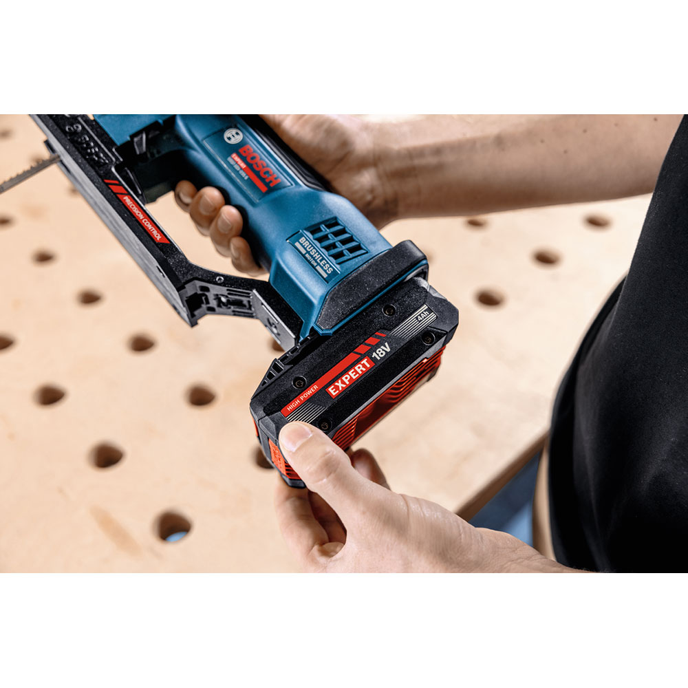 - Den er ideell til runde og tverrkutt i massivt tre, sponplater og komposittmaterialer, og for tykkere eller hardere materialer. Kompatibelt med Bosch Professional 18V System og batterier av forskjellige merker fra batterialliansen AMPShare.