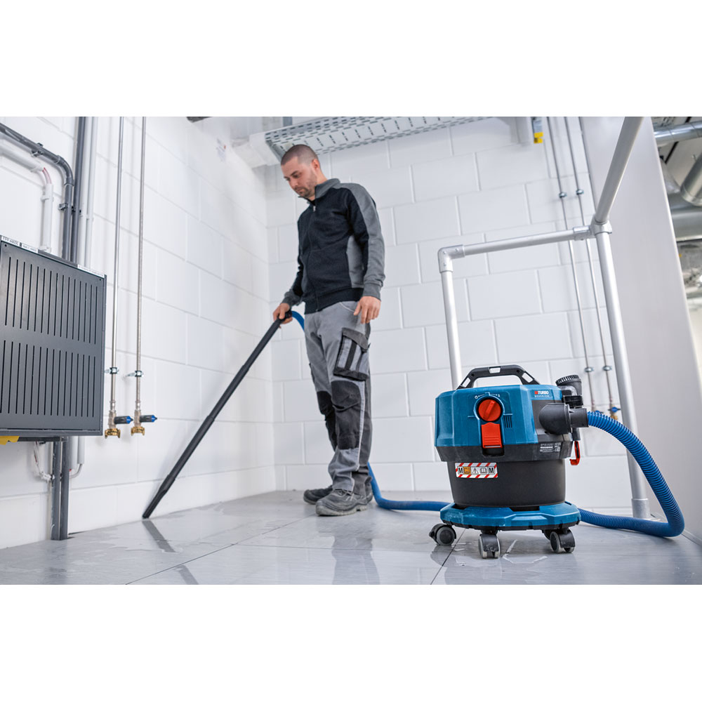 - Den batteridrevne støvsugeren GAS 18V-12 MC garanterer beskyttelse mot støv i klasse M. Den tar hånd om det meste av støvet på byggeplassen – for eksempel betong, teglstein, gips og sement. Den innovative løsningen med elektrostatisk utladning (ESD) fjerner automatisk elektriske ladninger, og Auto-Start tar hånd om inn- og utkoblingen av støvsugeren for deg, slik at du kan konsentrere deg om jobben. Du fester ganske enkelt Auto-Start-brikken på verktøyet og kobler det sammen med GAS 18V-12 MC. Etter sammenkobling registrerer Auto-Start vibrasjoner fra verktøyet når det er i bruk, og starter og/eller stopper automatisk støvsugeren for deg. Den kraftige BITURBO Brushless-motoren og et større filter sørger for svært god sugeeffekt for alle krevende oppgaver – med bare ett 18 V-batteri.