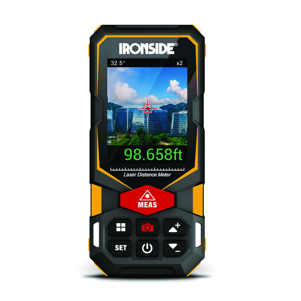 - Avstandsmåling, Overflatemåling, Kontinuerlig måling, Volummåling, Automatisk vater, Pythoagoras 2, Pythagoras 1, Add/subtraksjon. 2,0 tommers hvit på svart skjerm.