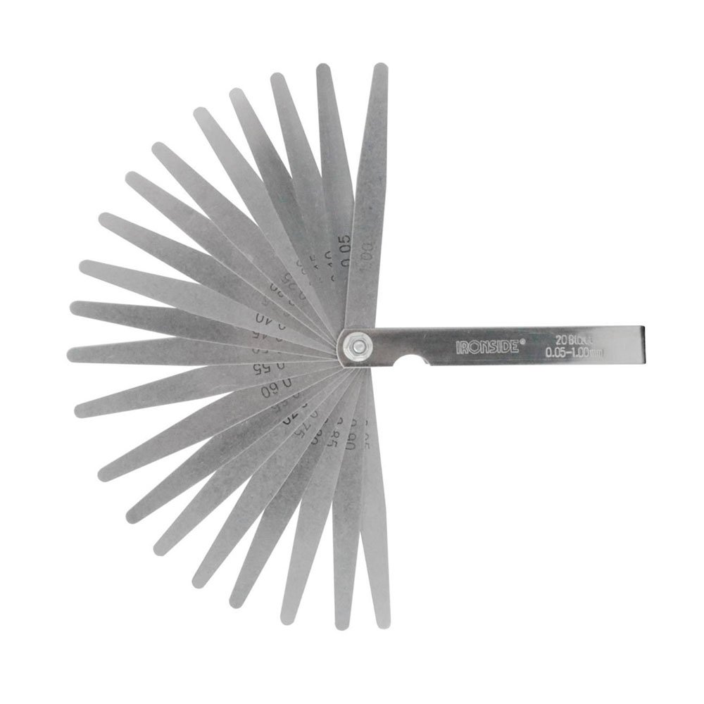 Med polerte blad av herdet fjærstål i millimeterdimensjoner. For måling av slisser, slark i lager etc. Med forniklet, låsbar holder.